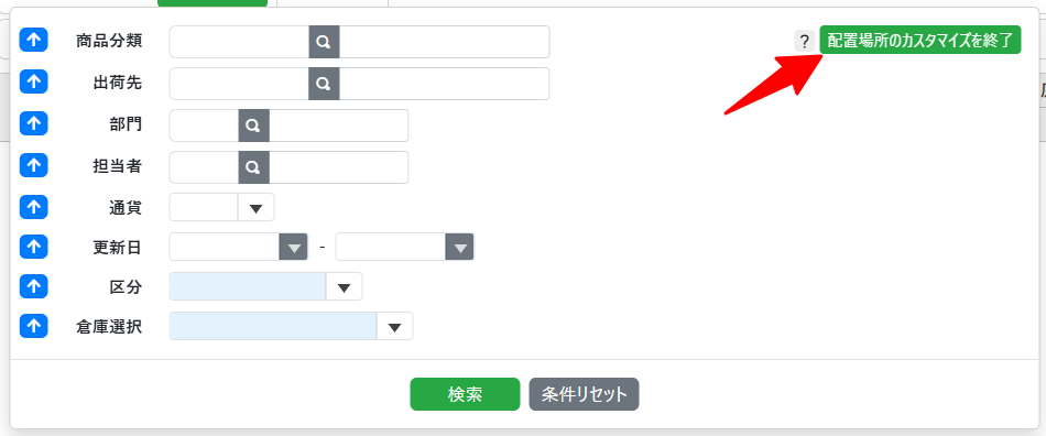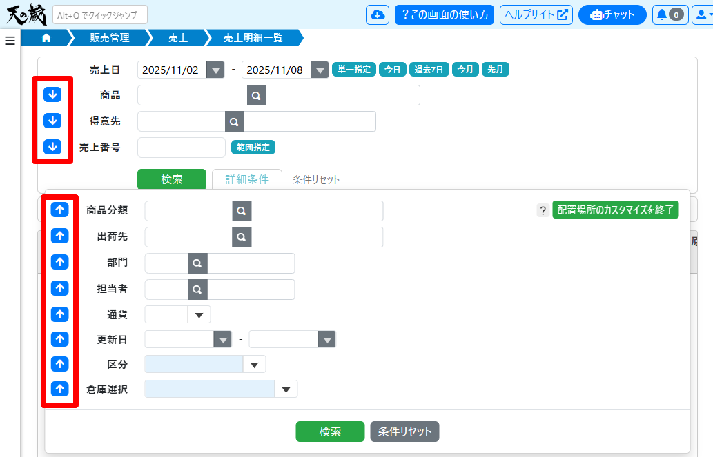 各検索条件項目の左側に、上向き矢印(⬆️)と下向き矢印(⬇️)ボタンが表示されます。