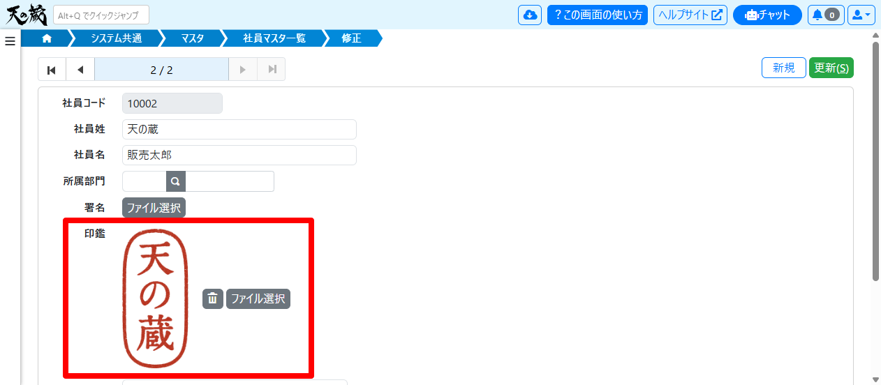 [印鑑]欄の[ファイル選択]をクリックして、担当者印の画像データを登録します。