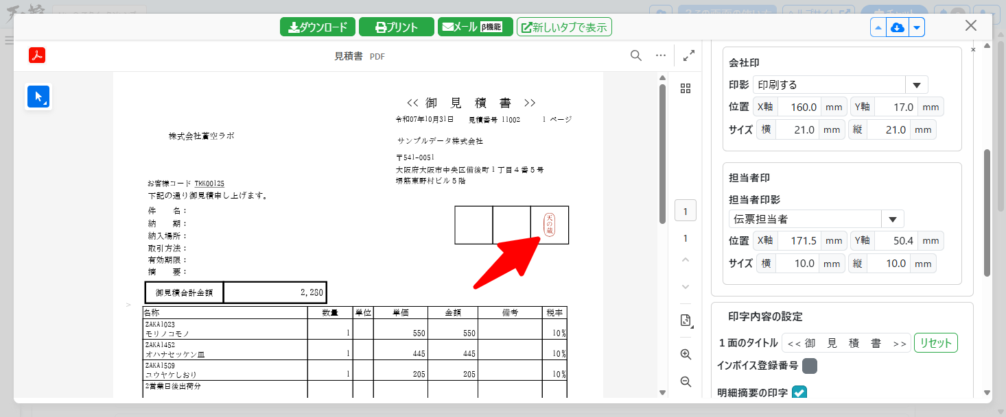 帳票の回覧枠に、担当者印(担当印の印影)を表示して発行する方法を紹介します。