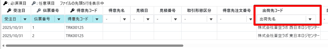 同一の取引先で同じ出荷先コード、もしくは同じ出荷先名が取り込みデータに複数ある場合、後の行の内容で更新されます。