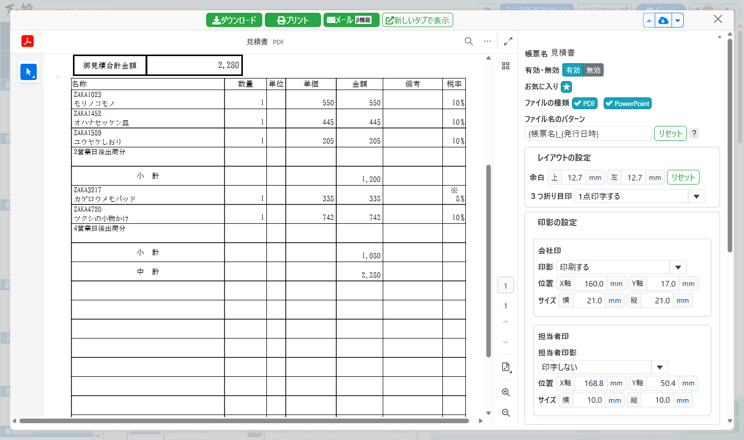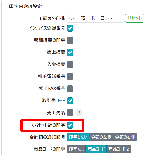 - [印字内容の設定]セクション内の[小計・中計の印字]を「印字する」に変更します。