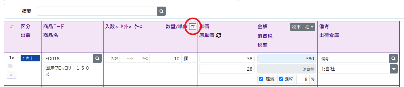 伝票入力中の在庫数を確認する 2025年10月20日 02:06 更新 伝票入力中の商品の在庫情報を確認することができます。下図の赤枠部のボタンをクリックすることで、入力中の全商品の在庫状況を確認することができます。在庫状況の表示ボタン 売上入力中の在庫確認在庫確認の表示例 関連記事 送料を入力する 伝票入力中の商品情報を確認する 支払区分の入力を記憶させる マスタデータを削除する 無効なマスタを有効に戻す コメント 0件のコメント 投稿したコメントはすべて一般公開され、どなたでも閲覧できます。 実名・電話番号・住所・メールアドレス等 個人の特定につながりかねない情報の書き込みはしないでください。 コメントを投稿すると、次のような情報も他のユーザーに表示されます。 自分のプロフィール。 自分が投稿した他のコメント。 サインインしてコメントを残してください。