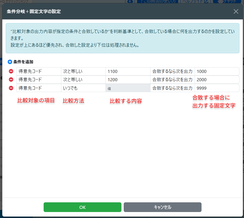 指定の項目の内容に基づき、条件に合致する場合に、指定した固定文字を出力します。