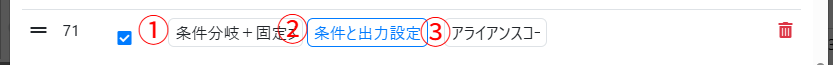 | ①条件分岐+固定文字 | 項目の内容が条件(一致、不一致、含む、含まれない、始まる等)に一致する場合に固定内容を出力します。 |