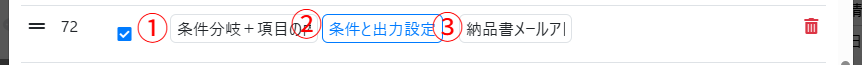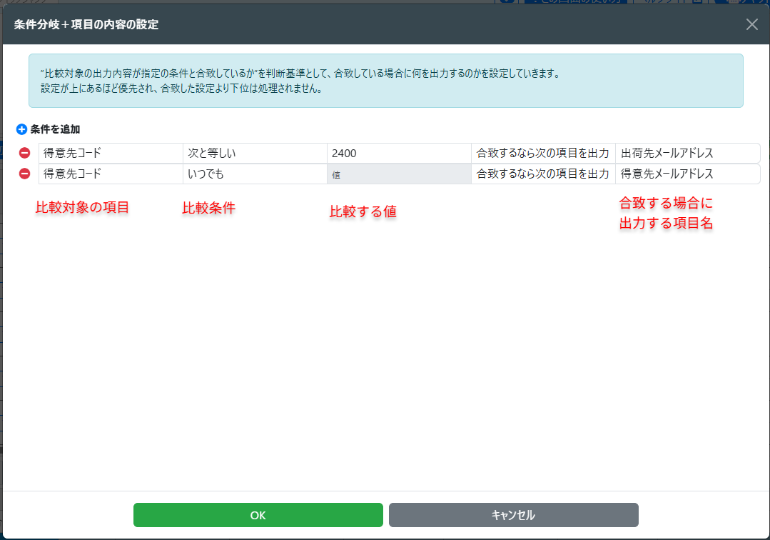 | ①条件分岐+項目の内容 | 項目の内容が条件(一致、不一致、含む、含まれない、始まる等)に一致する場合に指定項目の内容を出力します。 |