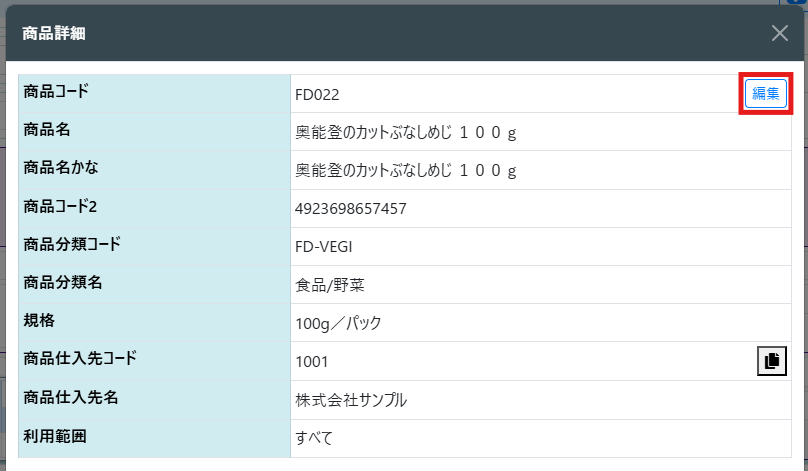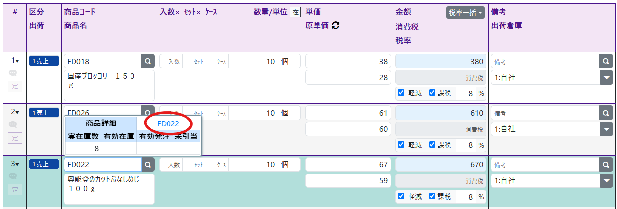 商品コード欄や商品名欄を入力中に表示される、下図の赤枠部分の商品コードをクリックすると、商品の詳細情報を確認できます。