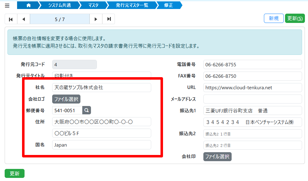 帳票の自社情報(発行元)を差し替える 2025年10月20日 04:38 更新 基本的な自社情報は[基本設定マスタ]で設定します。納品書や請求書など、一部の帳票の自社情報を差し替えたい場合は、[発行元マスタ]を設定します。 (関連:基本設定マスタを設定する、発行元マスタを設定する) 関連記事 一括登録でプレビューを活用する 請求書の自社情報(発行元)を変更する 発行元マスタを設定する 帳票に会社印(角印)を表示する 摘要定型文マスタの取込ファイルの仕様 コメント 0件のコメント 投稿したコメントはすべて一般公開され、どなたでも閲覧できます。 実名・電話番号・住所・メールアドレス等 個人の特定につながりかねない情報の書き込みはしないでください。 コメントを投稿すると、次のような情報も他のユーザーに表示されます。 自分のプロフィール。 自分が投稿した他のコメント。 サインインしてコメントを残してください。